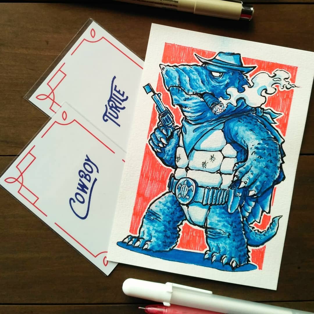Para isso, ele criou um baralho com várias palavras como “pirata”, “javali”, “zumbi” e “barco”. Para criar suas ilustrações, ele embaralha as cartas e pega duas palavras aleatórias.