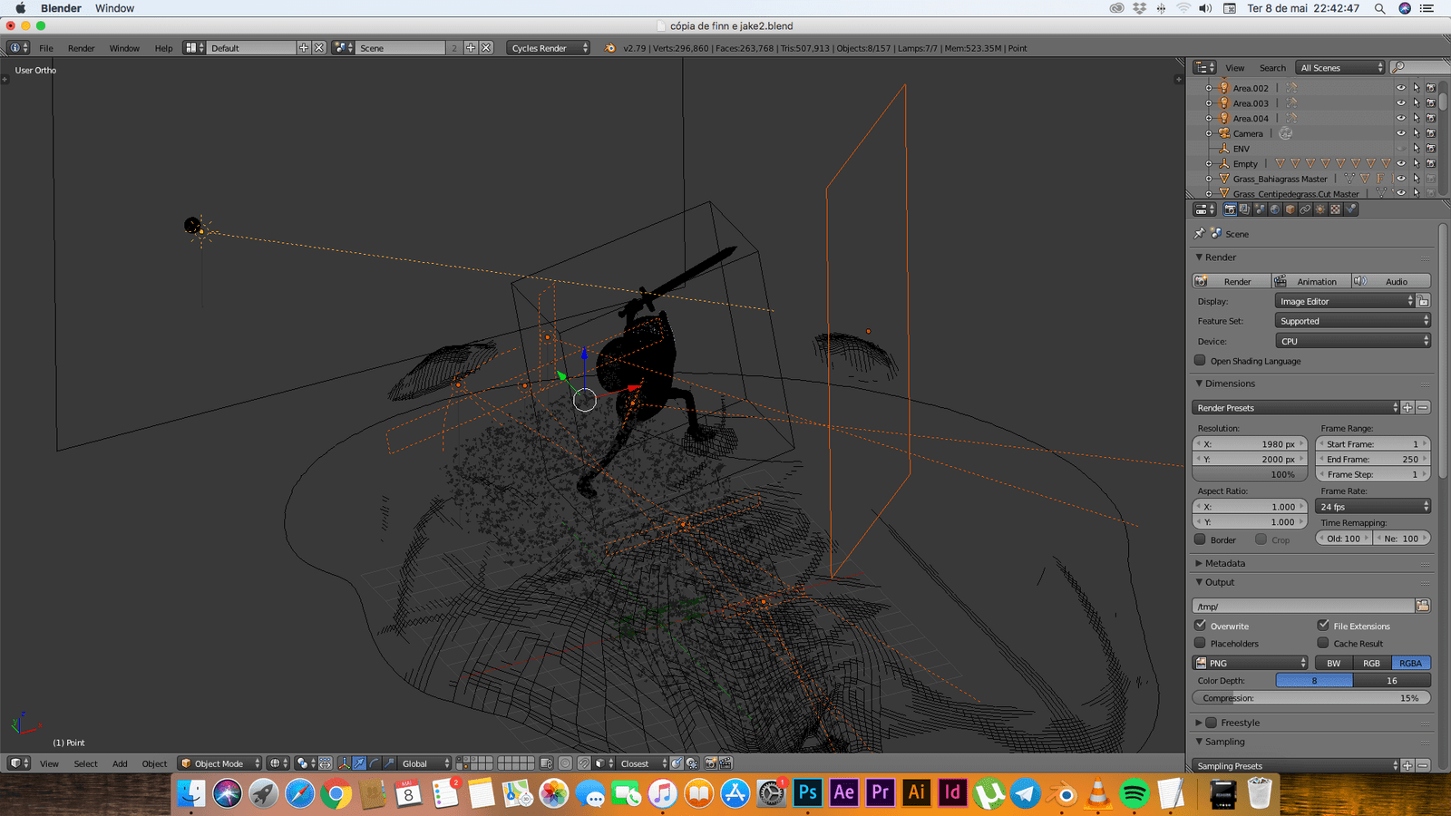 Com o personagem modelado exportei as UV Maps, para poder mapear as texturas do personagem e depois utilizei o Photoshop para pintar as malhas, o que também pode ser feito no Blender.