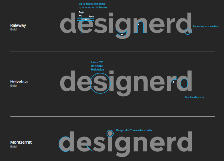 A construção da fonte do logotipo foi baseada em conceitos de três fontes já existentes: Raleway, Helvetica e Montserrat. Na imagem abaixo, você consegue notar os destaques para as seções que inspiraram o design final do logotipo.